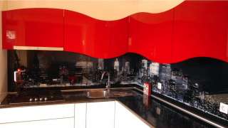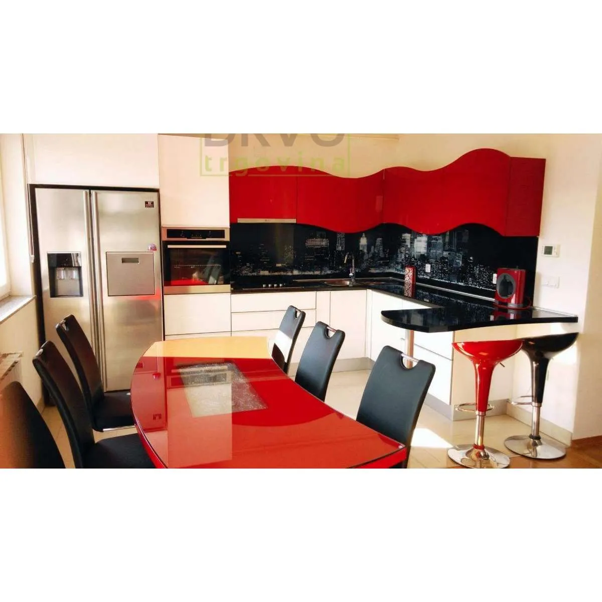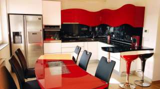 Unikatna kuhinja sa zaobljenim linijama, u crvenim, crnim i bijelim tonovima.