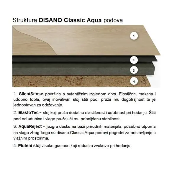 3. sloj: AquaReject – jezgra daske na bazi prirodnih materijala, posebno otporna na vlagu zbog čega su podovi pogodni za postavljanje i u vlažnim prostorima (kuhinje i kupaonice)
