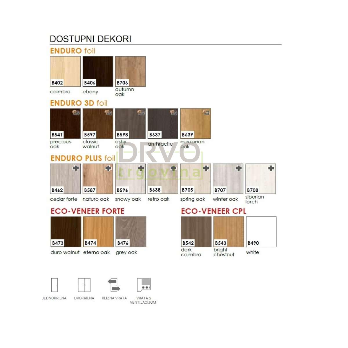 Vrata mogu doći u kombinaciji s raznim vrstama dovratnika i dodatnih funkcionalnosti. U ponudi su i brojni dekori, od modernih i minimalističkih do prirodnih natur tonova.