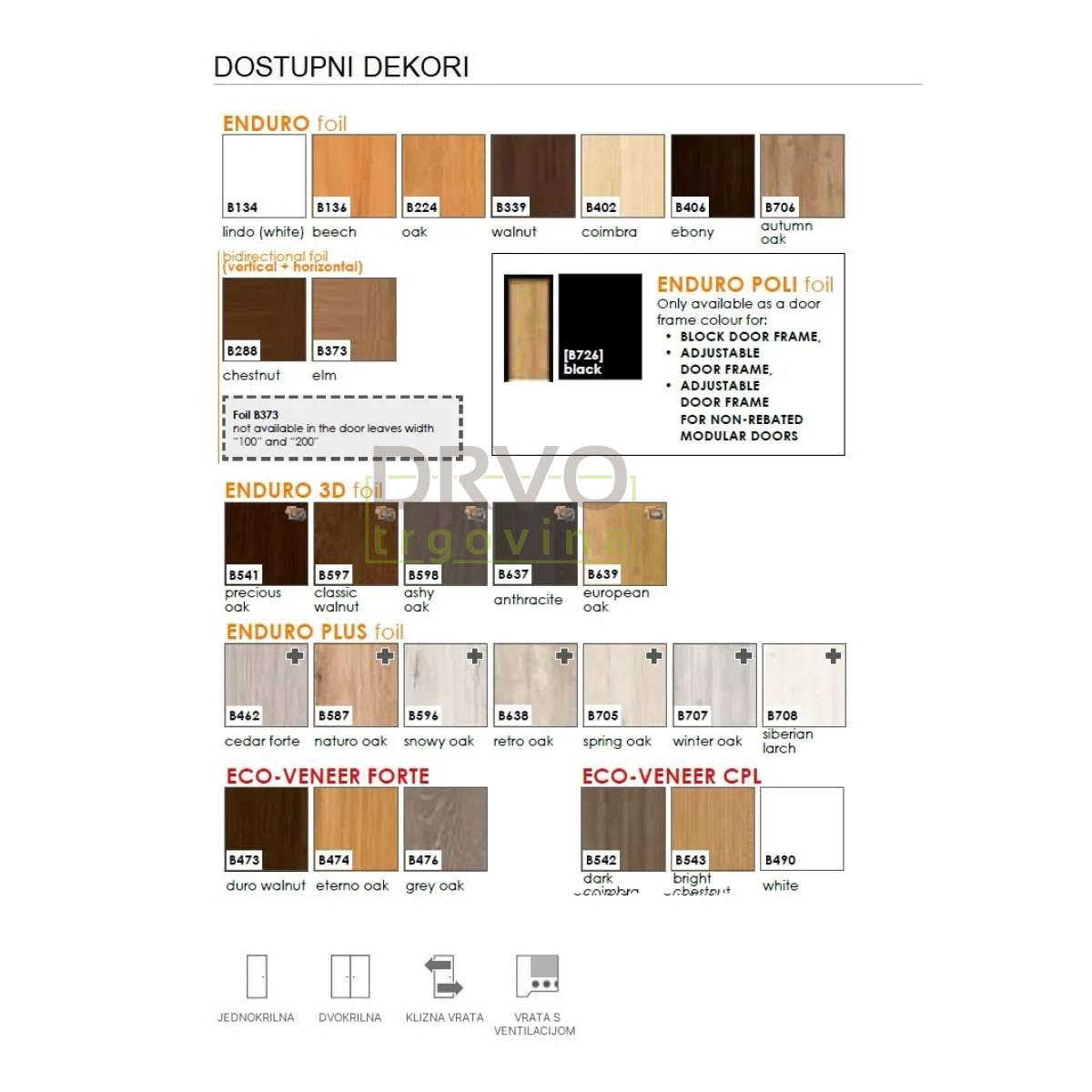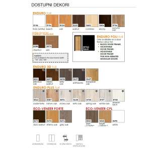 Vrata se mogu isporučiti u kombinaciji s raznim vrstama dovratnika, okova te dodatnih funkcionalnosti. U ponudi su i brojni dekori, od modernih i minimalističkih do prirodnih natur tonova.